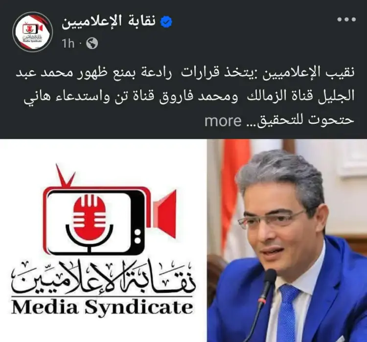 أصدر نقيب الإعلاميين الدكتور طارق سعده اليوم الأربعاء 15 ابريل 2026 مجموعة من القرارات العاجلة التي تستهدف ضبط المشهد الإعلامي الرياضي بعد رصد خروقات مهنية متعددة، حيث كشفت النقابة في بيان رسمي عن سبب إيقاف محمد عبدالجليل ومحمد فاروق واستدعاء هاني حتحوت للتحقيق، وذلك في إطار جهودها لضمان الالتزام بميثاق الشرف الإعلامي ومدونة السلوك المهني المعمول بها.