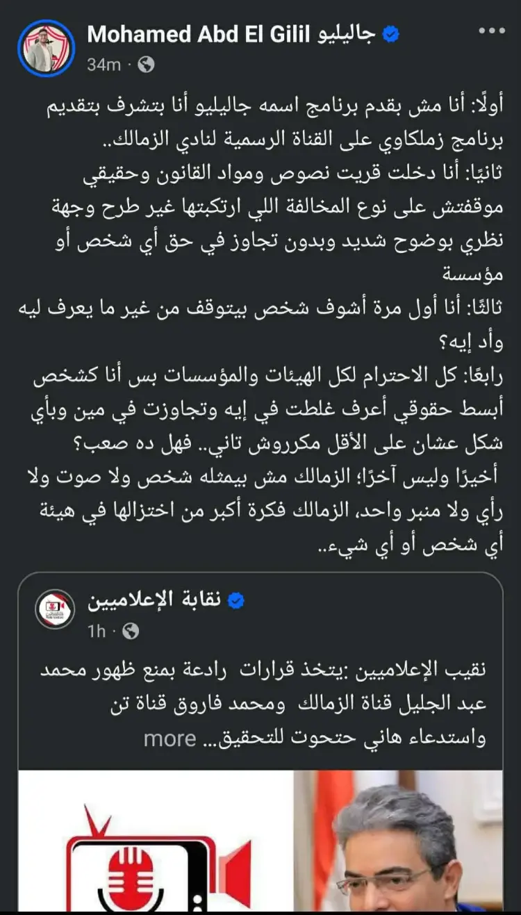 تضمنت القرارات منع ظهور مقدم برنامج «زملكاوي» بقناة الزمالك محمد عبدالجليل، ومقدم برنامج «البريمو» على شاشة قناة تن محمد فاروق، لمخالفتهما قانون النقابة رقم 93 لسنة 2016 وميثاق الشرف الإعلامي.