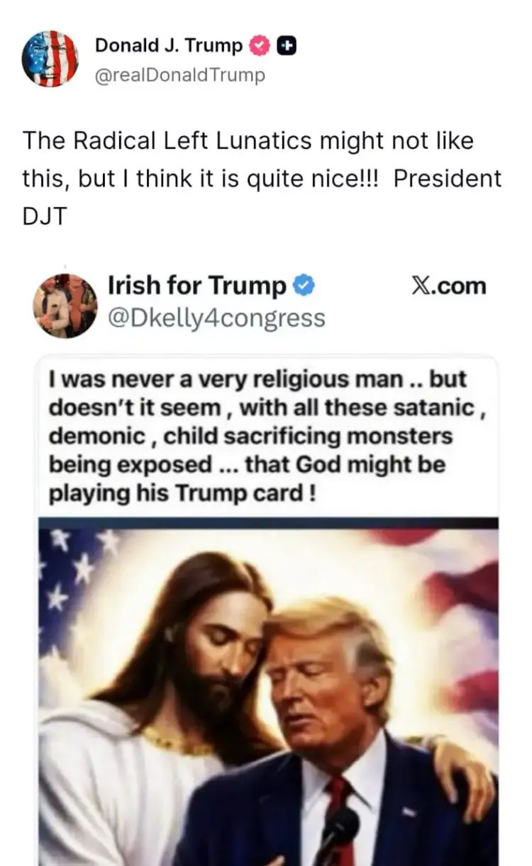 أظهرت الصورة التي أعاد ترامب تداولها مشهدا يجمعه بالسيد المسيح وهما في حالة عناق وتقارب، حيث يلامس جبين ترامب جبين الشخصية الدينية وعيناه مغمضتان، مع ظهور العلم الأمريكي بوضوح في الخلفية، وعلق ترامب على هذه الصورة بقوله إن هذا التصرف «قد لا يعجب المجانين اليساريين المتطرفين»، لكنه وصف المنشور بأنه «لطيف جدا».