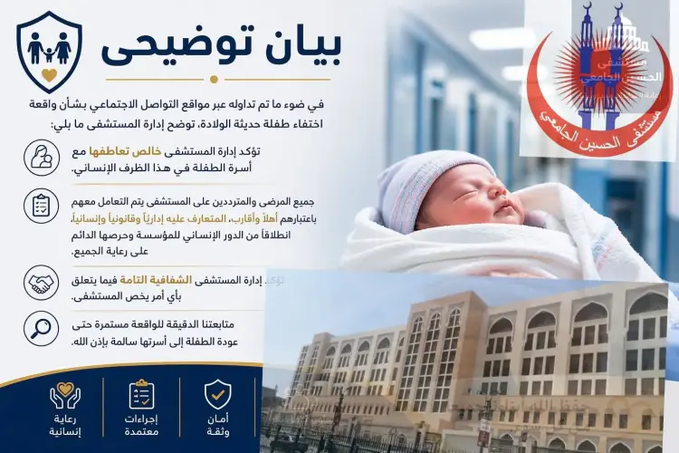 أصدرت إدارة مستشفى الحسين بيانا رسميا لتوضيح ملابسات واقعة اختطاف رضيعة حديثة الولادة من داخل قسم النساء والتوليد، مؤكدة أن الإجراءات الإدارية المتبعة تمت بشكل قانوني قبل وقوع الحادثة التي أثارت جدلا واسعا على منصات التواصل الاجتماعي، ومشددة في الوقت ذاته على تعاونها الكامل مع الجهات الأمنية لكشف تفاصيل الواقعة.