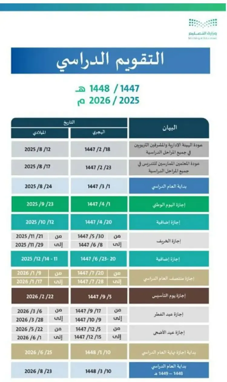 كشفت الوزارة عن موعد انطلاق العام الدراسي الجديد حيث تصبح بداية الدراسة يوم 23 أغسطس 2026 الموافق 10 ربيع الأول 1448 ويأتي ذلك ضمن الخطة الزمنية المعتمدة للتقويم الدراسي في المملكة.
