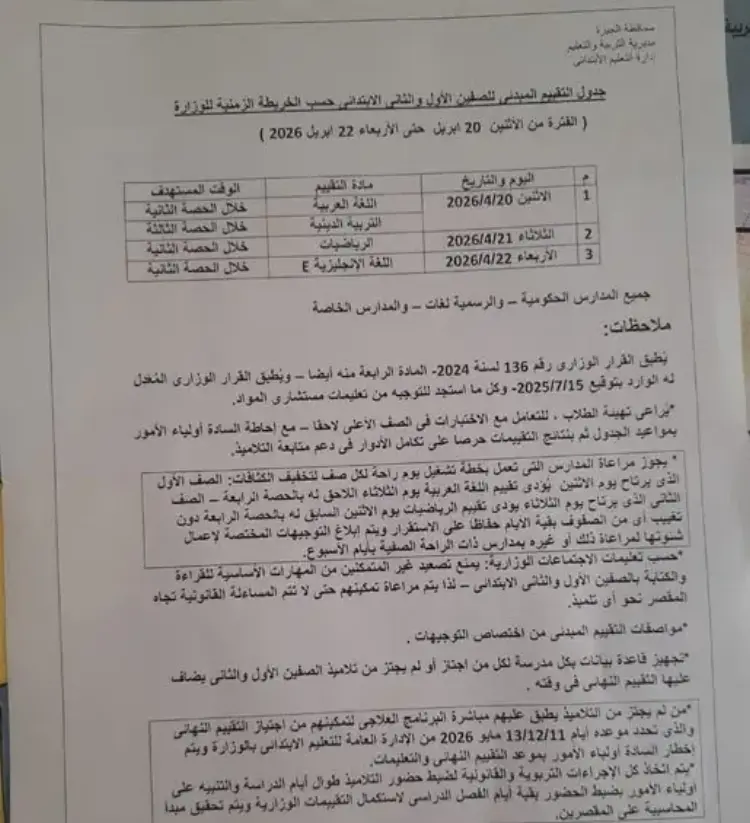موعد التقييم المبدئي لطلاب أولى وتانية ابتدائي بالجيزة 2026