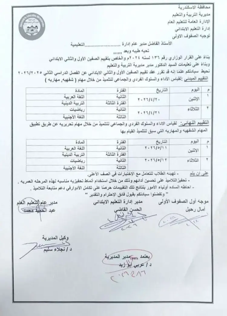 موعد امتحان التقييم النهائي للصف الأول والثاني الابتدائي الترم الثاني 2026 الإسكندرية