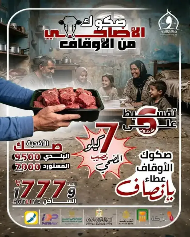 أعلنت وزارة الأوقاف المصرية عن إطلاق مشروع صكوك الأضاحي لعام 2026م - 1447هـ، بالتعاون مع وزارتي التموين والتضامن الاجتماعي، لتوفير اللحوم للأسر الأولى بالرعاية.
