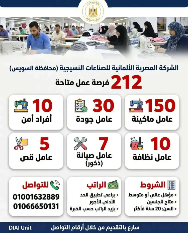 كشفت الشركة المصرية الألمانية للصناعات النسيجية بمحافظة السويس عن حاجتها لشغل 212 فرصة عمل متاحة، حيث طلبت الشركة 150 عامل ماكينة، و30 عامل جودة، و10 أفراد أمن، بالإضافة إلى 10 عمال نظافة، و7 عمال صيانة من الذكور، و5 عمال في قسم القص، وذلك للعمل في مقر الشركة بمحافظة السويس وفقا للبيانات الرسمية الصادرة عن الوزارة.
