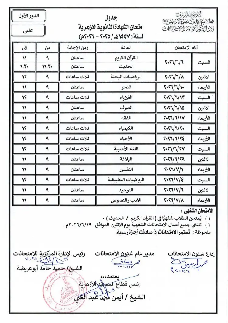 جدول امتحانات الشهادة الثانوية الأزهرية 2026 علمي الدور الأول
