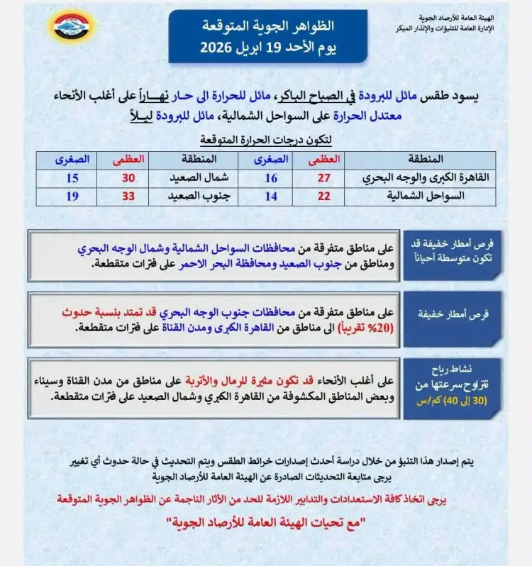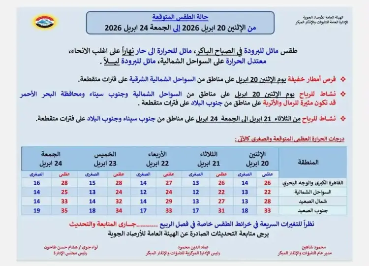 أشارت نشرة التنبؤات الجوية إلى استمرار نشاط الرياح من الثلاثاء 21 ابريل حتى الجمعة 24 ابريل على مناطق من جنوب سيناء وجنوب البلاد، كما أوضحت الهيئة جدول درجات الحرارة المتوقعة، حيث تسجل القاهرة الكبرى والوجه البحري عظمى 26 درجة يوم الاثنين وتصل إلى 28 درجة يوم الجمعة، بينما تتراوح العظمى في السواحل الشمالية بين 22 و25 درجة مئوية على مدار الأسبوع.