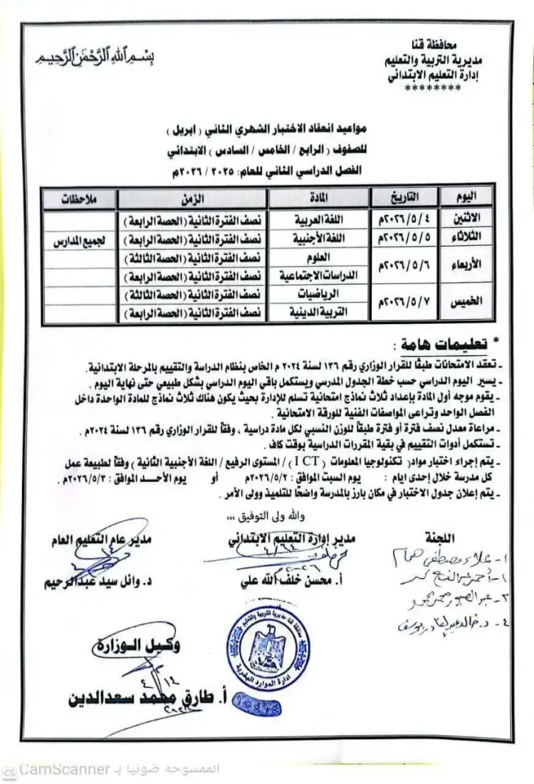 جدول امتحانات شهر أبريل خامسة ابتدائي 2026 محافظة قنا