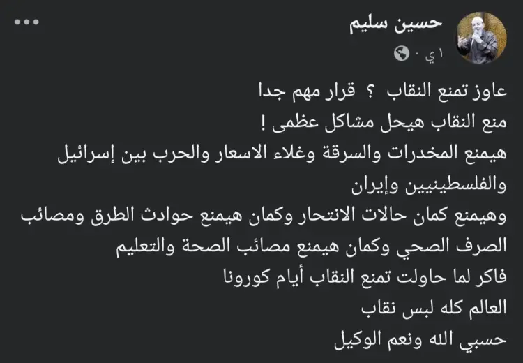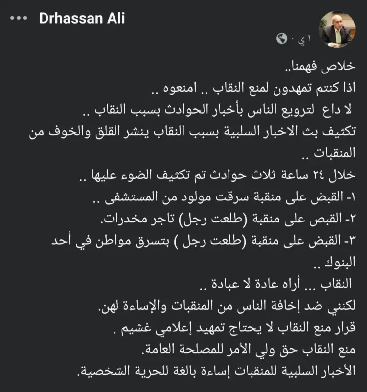 واستنكر علي المناداة بـ منع النقاب بناء على حالات فردية لإساءة استخدامه، مشبها الأمر بالمطالبة بمنع «الكمامات» الطبية لأن البعض قد يتستر خلفها لارتكاب جرائم، مقترحا بدائل تنظيمية مثل تخصيص غرف تفتيش للسيدات عند مداخل المستشفيات والجامعات للتحقق من الهوية دون الحاجة لمنع الزي بشكل كامل.