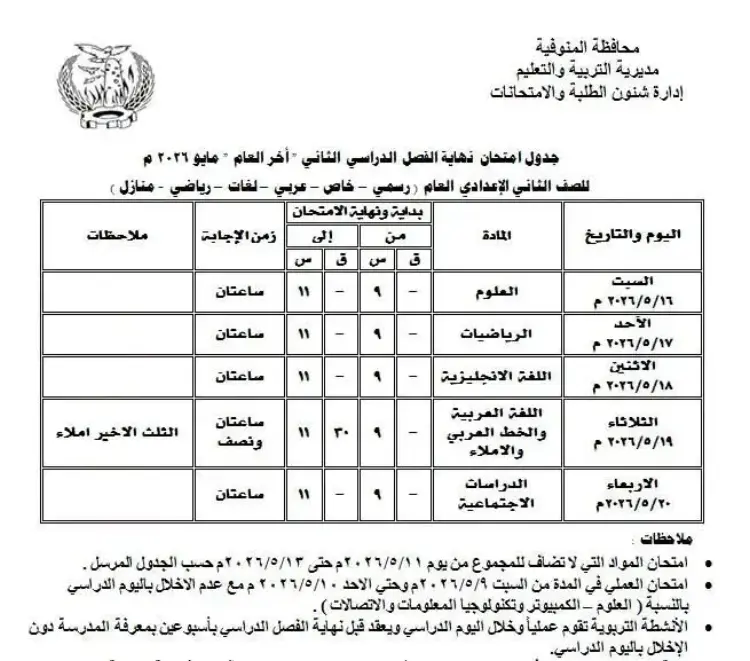 جدول امتحانات الصف الثاني الإعدادي الترم الثاني 2026 المنوفية (مستند)
