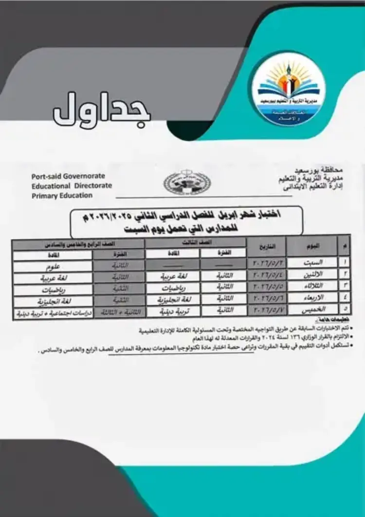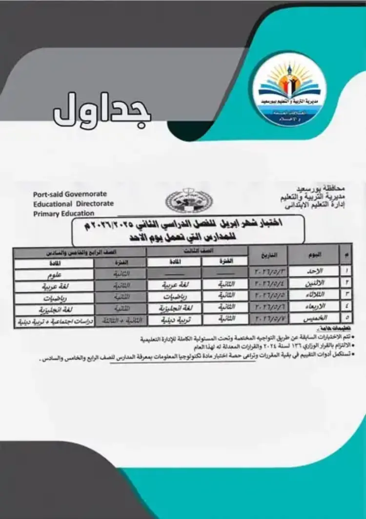 مواعيد جدول امتحانات شهر أبريل المرحلة الابتدائية بورسعيد 2026
