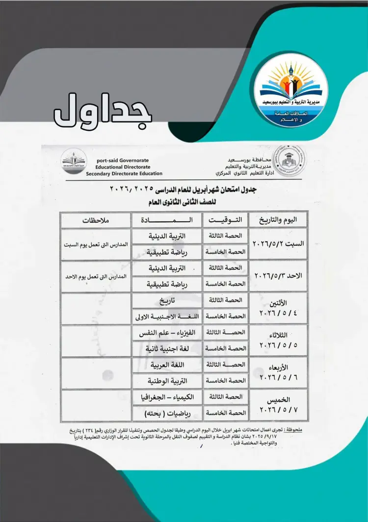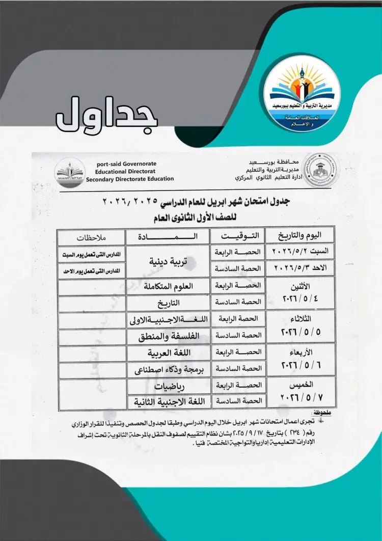 جداول امتحانات شهر أبريل لصفوف النقل بالمرحلة الثانوية في بورسعيد 2026