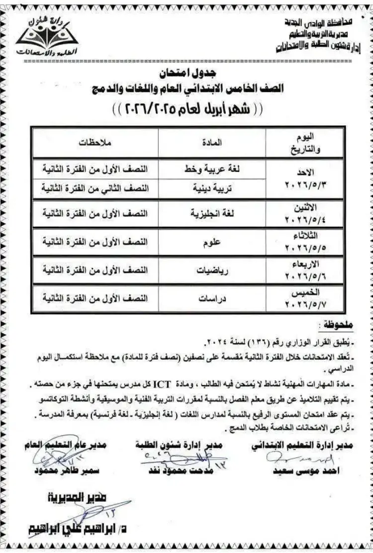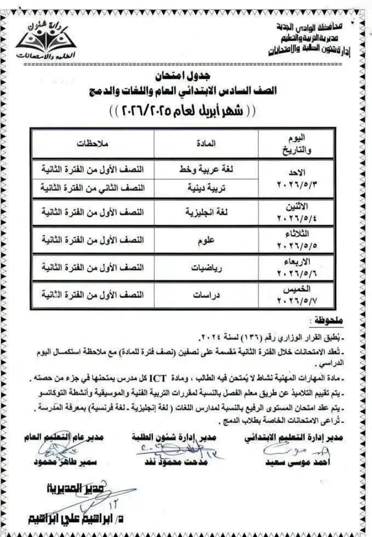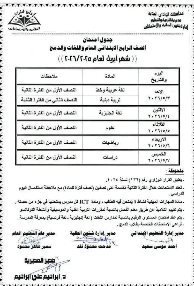جدول امتحانات شهر أبريل الصف الرابع والخامس والسادس الابتدائي محافظة الوادي الجديد 2026