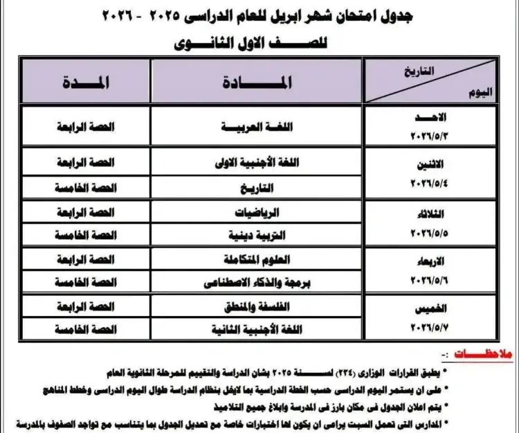 - الأحد 3 مايو 2026: عقد امتحان مادة اللغة العربية في الحصة الرابعة.