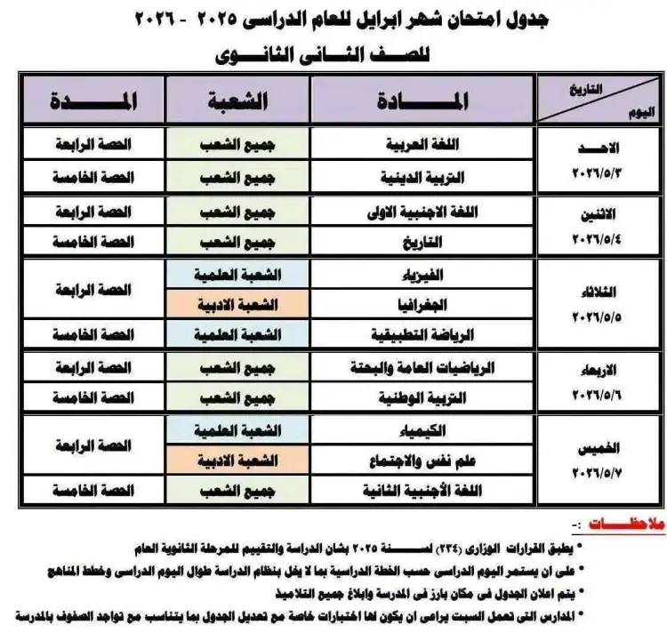 - الخميس 7 مايو 2026: اختتام الامتحانات بمادة الكيمياء للعلمي، وعلم النفس والاجتماع للأدبي في الحصة الرابعة، واللغة الأجنبية الثانية للجميع في الحصة الخامسة.