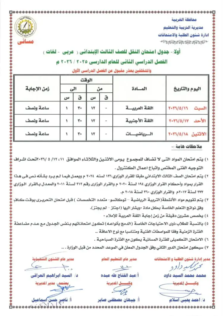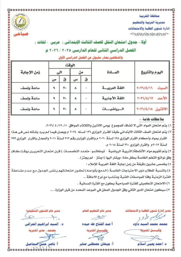 جدول امتحانات الصف الثالث الابتدائي بمحافظة الغربيه الترم الثاني 2026 لمدارس العربي واللغات