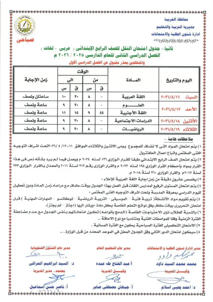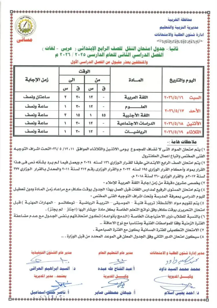 مواعيد امتحانات رابعة ابتدائي محافظة الغربية الفصل الدراسي الثاني لعام 2026