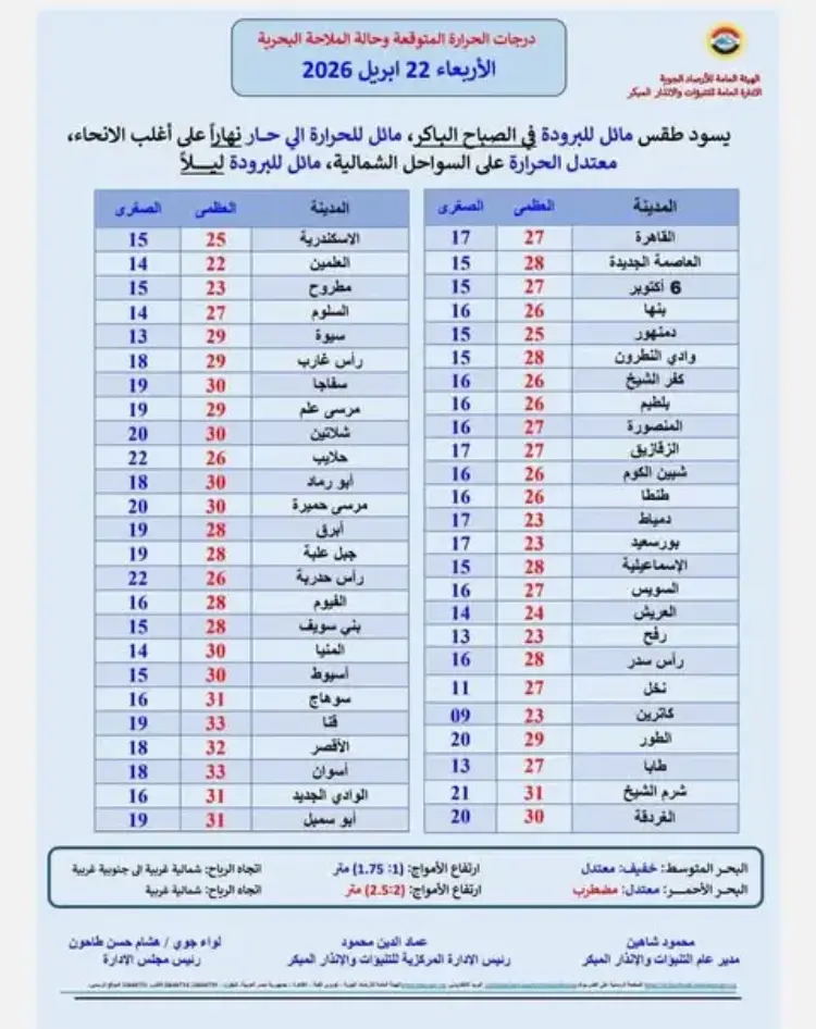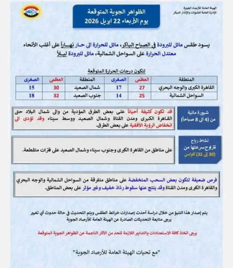 وتوقعت الهيئة في بيانها الصادر ليوم الأربعاء 22 أبريل 2026 ظهور شبورة مائية قد تكون كثيفة أحيانا خلال الفترة من الرابعة وحتى الثامنة صباحا، وتتركز هذه الظاهرة على بعض الطرق المؤدية من وإلى شمال البلاد وصولا إلى القاهرة الكبرى ومدن القناة وشمال الصعيد ووسط سيناء، مما قد يؤدي إلى انخفاض ملحوظ في الرؤية الأفقية على بعض الطرق السريعة والزراعية، وهو ما يستوجب الحذر عند تحديد حالة الطقس غدا للمسافرين.