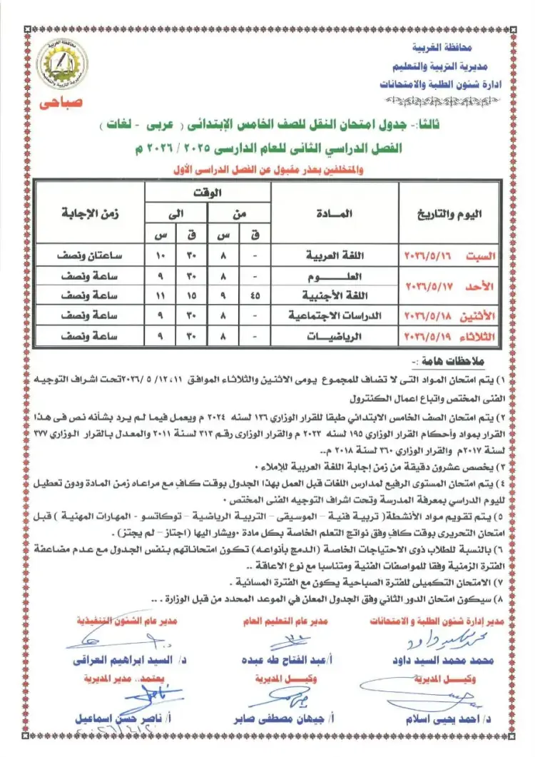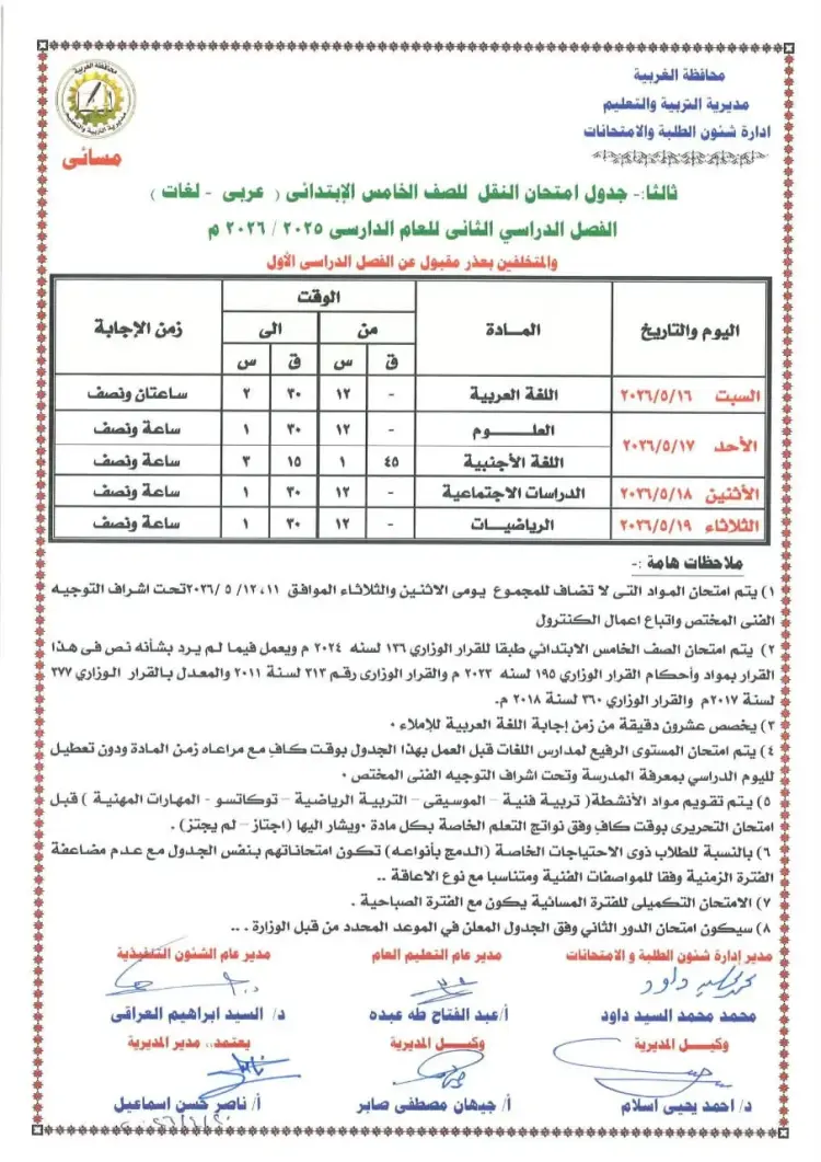 جدول امتحانات الصف الخامس الابتدائي محافظة الغربية الترم الثاني 2026 لمدارس العربي واللغات