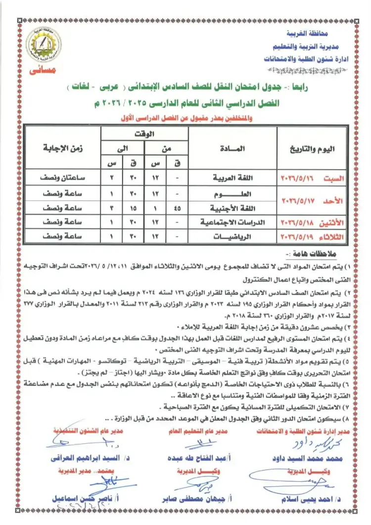 جدول امتحانات الصف السادس الابتدائي محافظة الغربية الترم الثاني 2026 لطلاب العربي واللغات