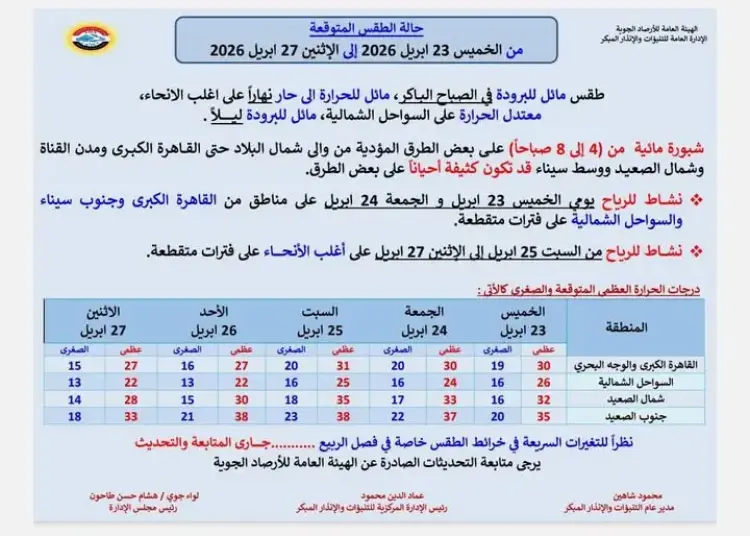 كشفت الهيئة العامة للأرصاد الجوية عن تفاصيل حالة الطقس المتوقعة خلال الفترة من الخميس 23 أبريل وحتى الاثنين 27 أبريل 2026، حيث تشهد البلاد حالة من التباين في درجات الحرارة بين الصباح والليل.