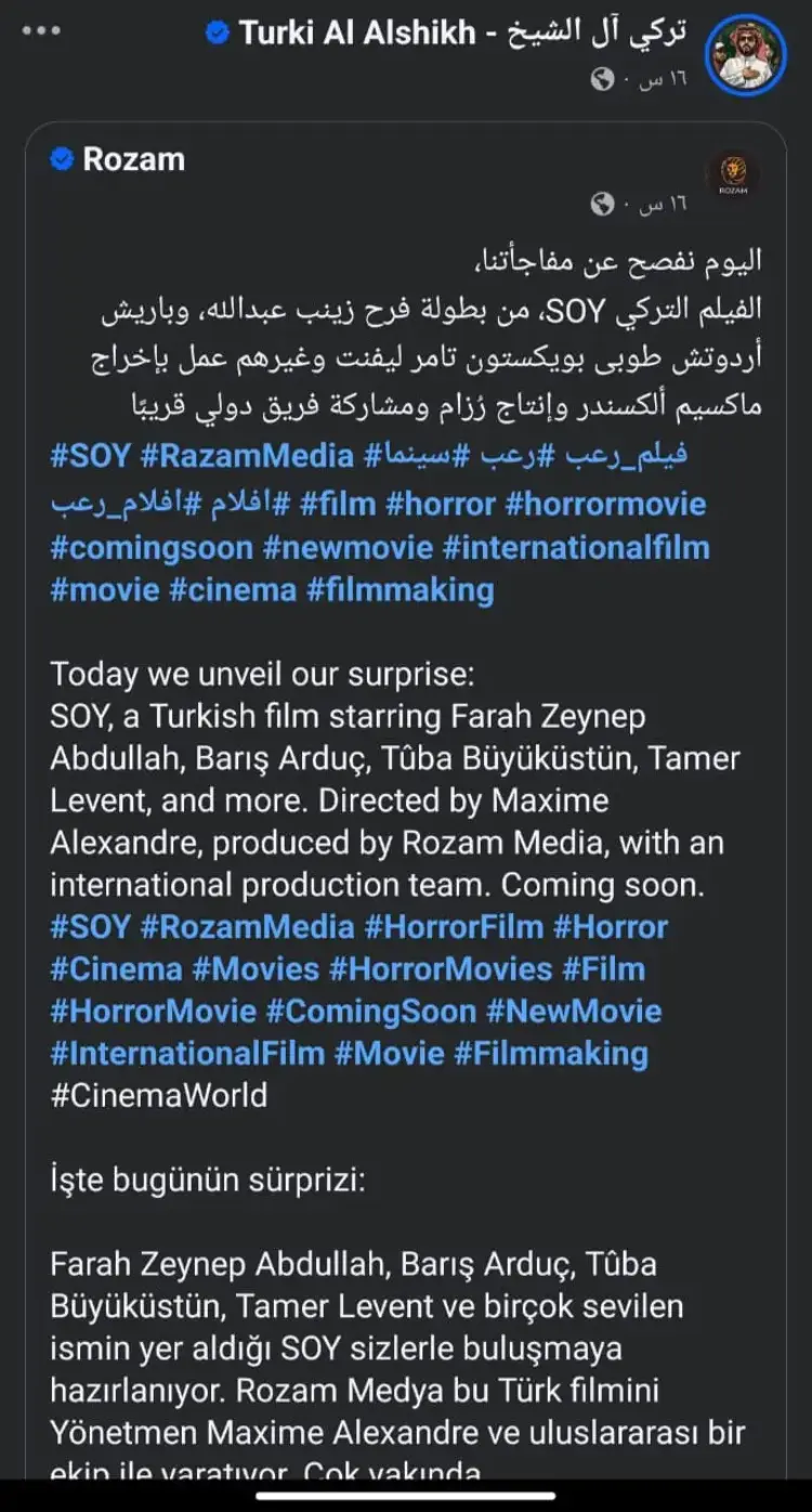 ونشر آل الشيخ عبر حساباته الرسمية على مواقع التواصل الاجتماعي مجموعة من الصور التي توثق التحضيرات النهائية لبداية تصوير فيلم SOY، مؤكدا أن العمل يمثل خطوة جديدة في مسيرته كصانع للأفكار الفنية، مع وجود مفاجآت مرتقبة تتعلق بمشاركة أسماء تركية وازنة، وأوضح أن المشروع يأتي في سياق التعاون الفني الممتد لتقديم محتوى يجمع بين الإبهار البصري والجودة الدرامية التي تستهدف الجمهور العربي والدولي على حد سواء.