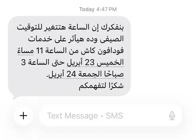 أطلقت شركات المحمول في مصر اليوم الخميس 23 أبريل 2026 تحذيرات عاجلة لمستخدمي خدمات الدفع الرقمي بشأن توقف خدمات المحافظ الإلكترونية بشكل مؤقت لعدة ساعات مساء اليوم، حيث تبدأ الشركات إجراء تحديثات تقنية شاملة لتتوافق الأنظمة مع تغيير الساعة، وناشدت الشركات العملاء بضرورة إنهاء معاملاتهم المالية قبل المواعيد المحددة لتفادي أي مشكلات تقنية أو تأخير في تنفيذ العمليات ليلة الجمعة 24 أبريل.