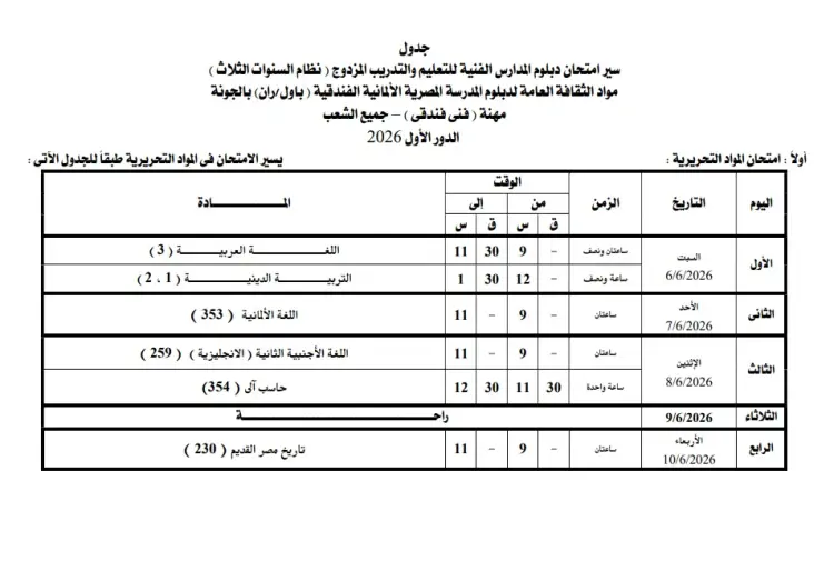 مواعيد اختبارات الدور الأول لطلاب التعليم والتدريب المزدوج بمهنة فني فندقي 2026