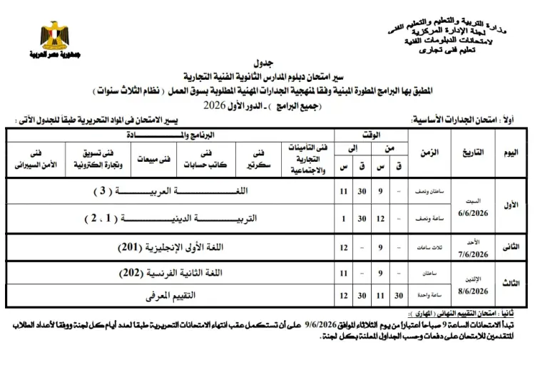 جدول امتحانات دبلوم المدارس الثانوية الفنية التجارية - الجدارات المهنية نظام الثلاث سنوات 2026