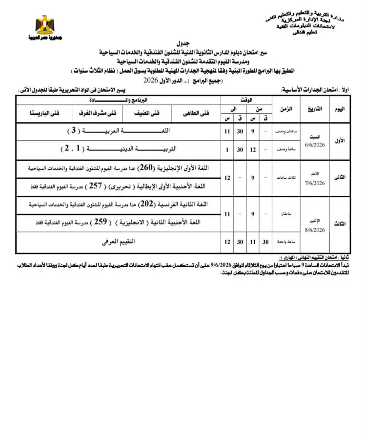 جدول امتحانات الصف الثالث الثانوي التجاري الفندقي وخدمات السياحة 2026