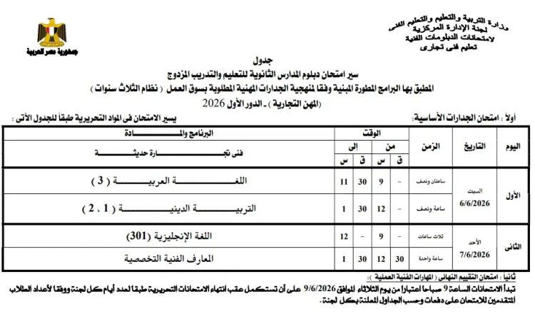 جدول امتحانات دبلوم المدارس الثانوي للتعليم والتدريب المزدوج - الجدارات المهنية نظام الثلاث سنوات 2026