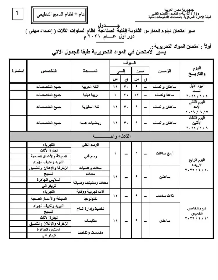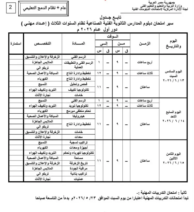 جدول امتحانات الصف الثالث الثانوي الفنية الصناعية إعداد مهني نظام 3 سنوات 2026