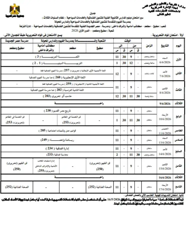 مواعيد امتحانات دبلوم المدارس الثانوية الفنية للشئون الفندقية 2026 لجميع الشعب