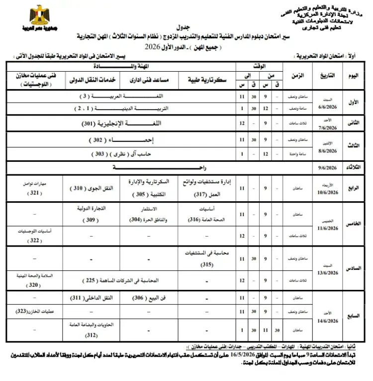 جدول امتحانات التعليم والتدريب المزدوج تجارة 2026 نظام الثلاث سنوات