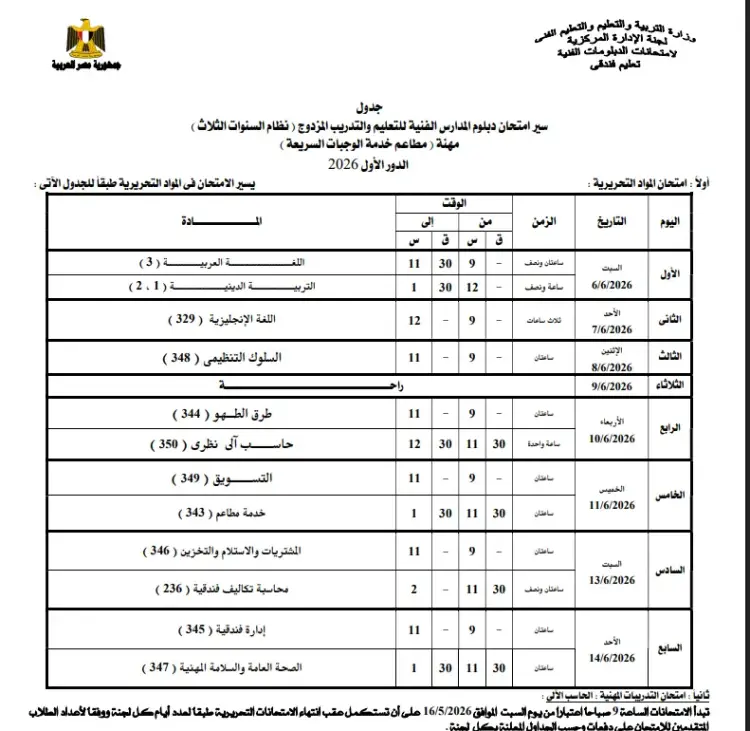 مواعيد امتحانات دبلوم المدارس الفنية للتعليم والتدريب المزدوج مطاعم خدمة والوجبات السريعة 2026