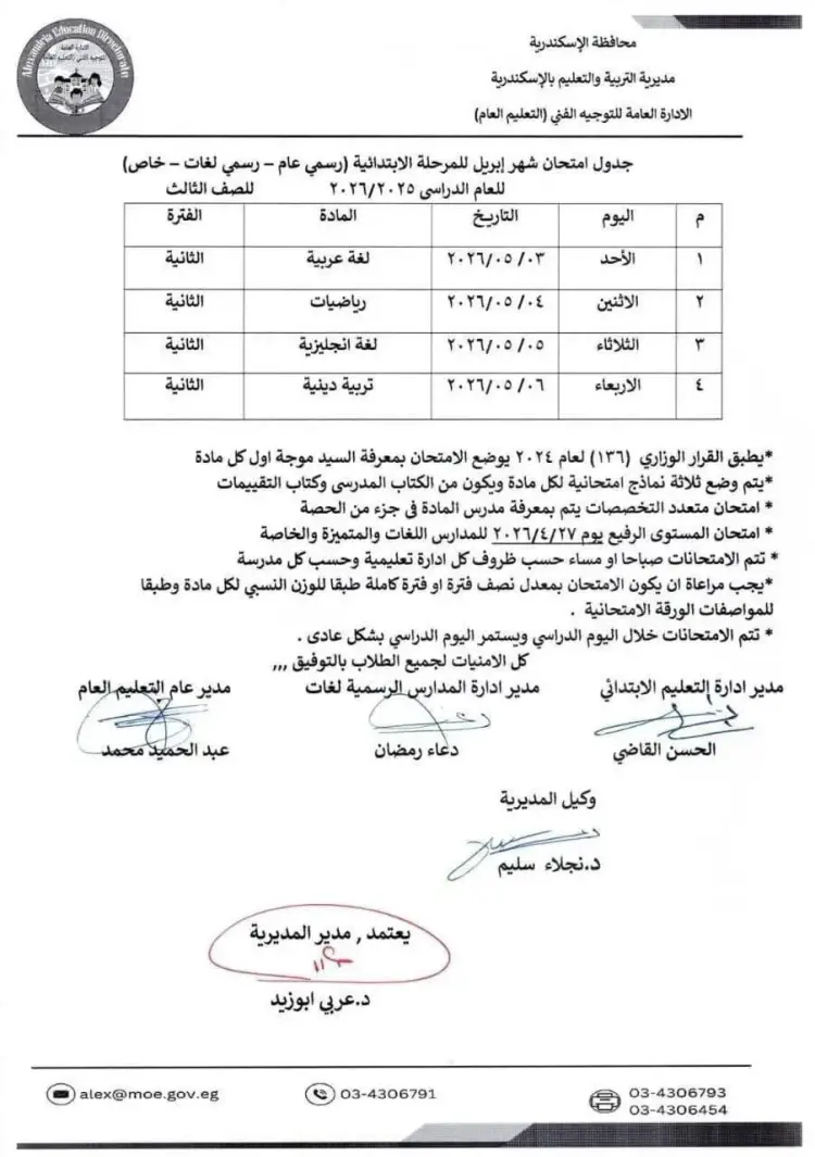 جدول امتحانات تالتة ابتدائي شهر أبريل 2026 الإسكندرية