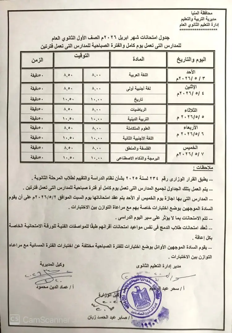 جدول امتحانات شهر مايو أولى وتانية ثانوي محافظة المنيا