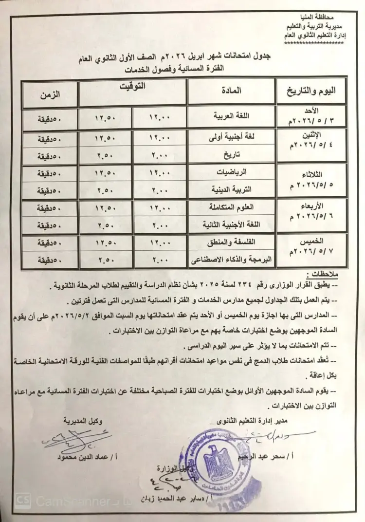 جدول امتحانات شهر أبريل للصف الأول والثاني الثانوي محافظة المنيا 2026