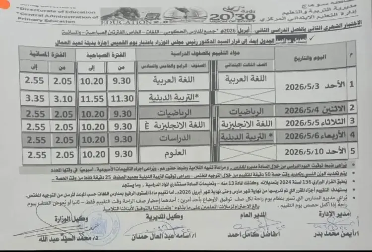 أفصحت مديرية التربية والتعليم بمحافظة سوهاج عن الجدول الزمني المعدل لاختبارات شهر أبريل لعام 2026 م لطلاب المرحلة الابتدائية بجميع المدارس الحكومية والخاصة واللغات، حيث جاء هذا التعديل بناء على قرار رئيس مجلس الوزراء باعتبار يوم الخميس 7 مايو 2026 إجازة رسمية بديلة لعيد العمال.