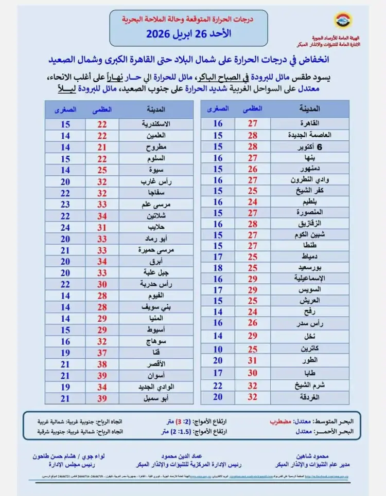 تشير بيانات الهيئة العامة للأرصاد الجوية إلى رصد انخفاض في درجات الحرارة ليوم غد الأحد على شمال البلاد حتى القاهرة الكبرى وشمال الصعيد، حيث يسود طقس مائل للبرودة في الصباح الباكر ومائل للحرارة نهارا على أغلب الأنحاء، وتسجل القاهرة والعاصمة الجديدة و6 أكتوبر درجات حرارة عظمى تتراوح بين 27 و28 درجة مئوية، فيما تنخفض في الإسكندرية ومطروح والسلوم لتسجل درجات عظمى بين 21 و22 درجة مئوية فقط.