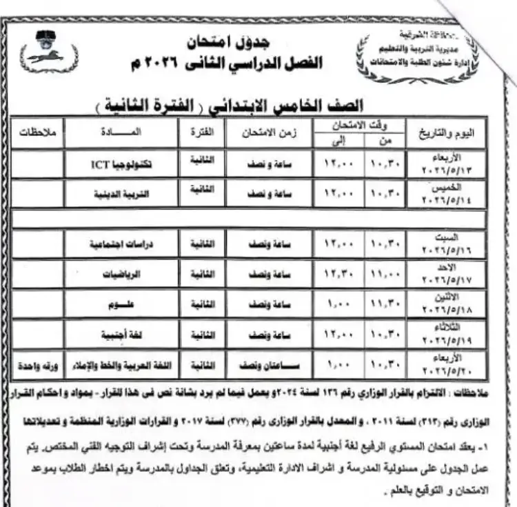 جدول امتحانات الصف الخامس الابتدائي بالشرقية 2026 الترم الثاني