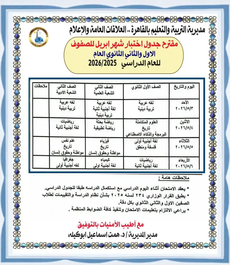 وأعلنت مديرية التربية والتعليم بالقاهرة عن مقترح جدول امتحانات شهر أبريل للصف الأول والثاني الثانوي العام للعام الدراسي 2025/2026، والذي يحدد المواعيد الرسمية لاختبارات التقييم الشهرية لطلاب مرحلة النقل بالثانوي العام.