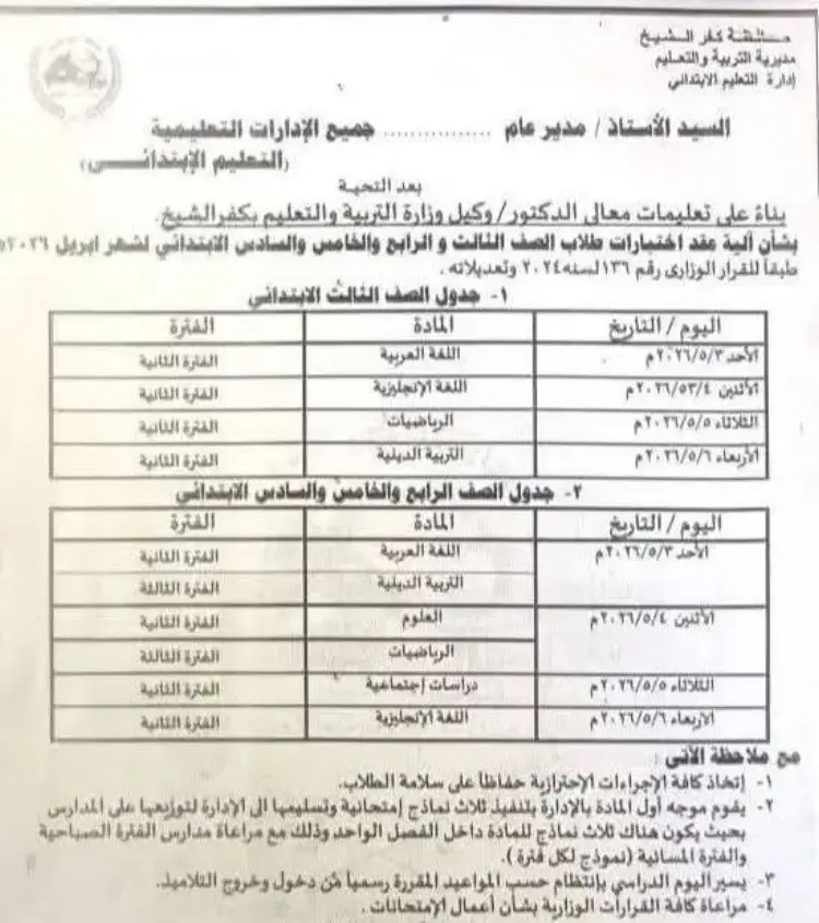 جدول امتحانات شهر أبريل للصف الخامس الابتدائي محافظة كفر الشيخ 2026