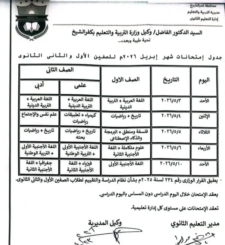 جدول امتحانات شهر أبريل أولى ثانوي محافظة كفر الشيخ 2026