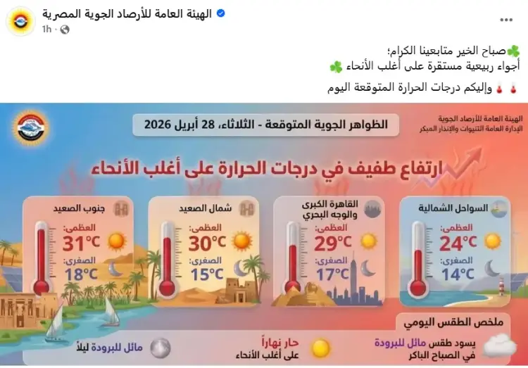 تشير توقعات الهيئة العامة للأرصاد الجوية إلى ارتفاع طفيف وتدريجي في درجات الحرارة على أغلب أنحاء الجمهورية خلال اليوم الثلاثاء 28 أبريل 2026، بقيم تتراوح بين درجتين إلى ثلاث درجات مقارنة بالأيام السابقة.