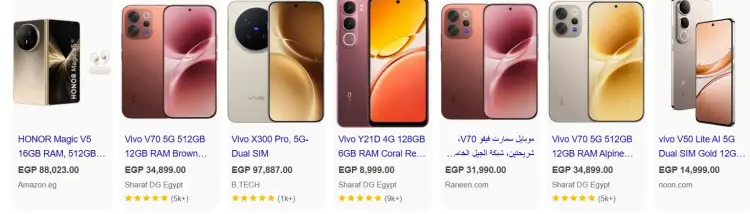 وترتفع الأسعار في الفئة المتوسطة عبر سلسلة V، التي تشمل هواتف مثل V40 وV60 Lite وV70 FE، حيث تبدأ الأسعار من حوالي 15,999 جنيها وتصل إلى 35,000 جنيه مصري حسب النسخة وسعة التخزين.