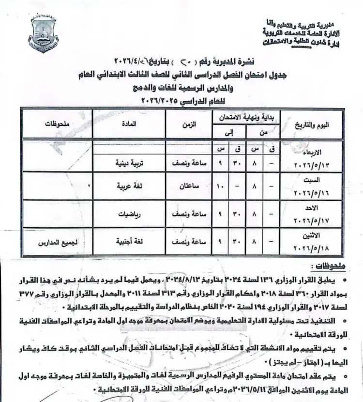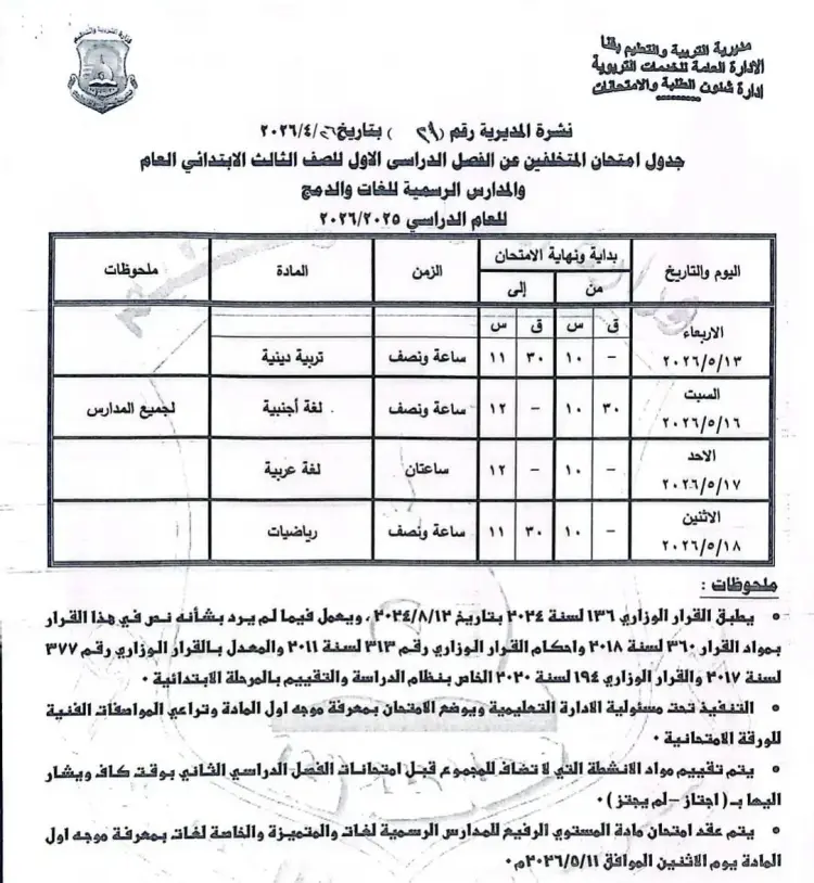 أعلنت مديرية التربية والتعليم بقنا عن جدول امتحانات الطلاب المتخلفين عن الفصل الدراسي الأول للصف الثالث الابتدائي، للعام الدراسي 2025/2026، وذلك وفقًا للنشرة الرسمية رقم (21) الصادرة في السادس من أبريل 2026 عن الإدارة العامة للخدمات التربوية، إدارة شؤون الطلبة والامتحانات.