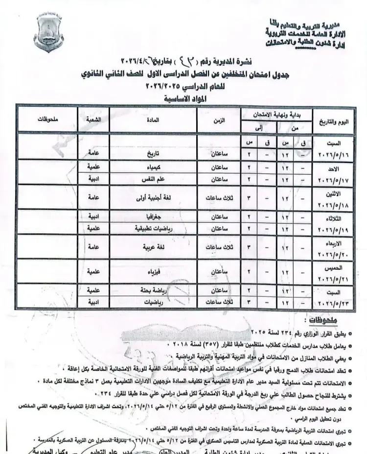 السبت 2026/05/16: مادة التاريخ (للشعبة العامة) من 12:00 إلى 02:00 - زمن الإجابة ساعتان.