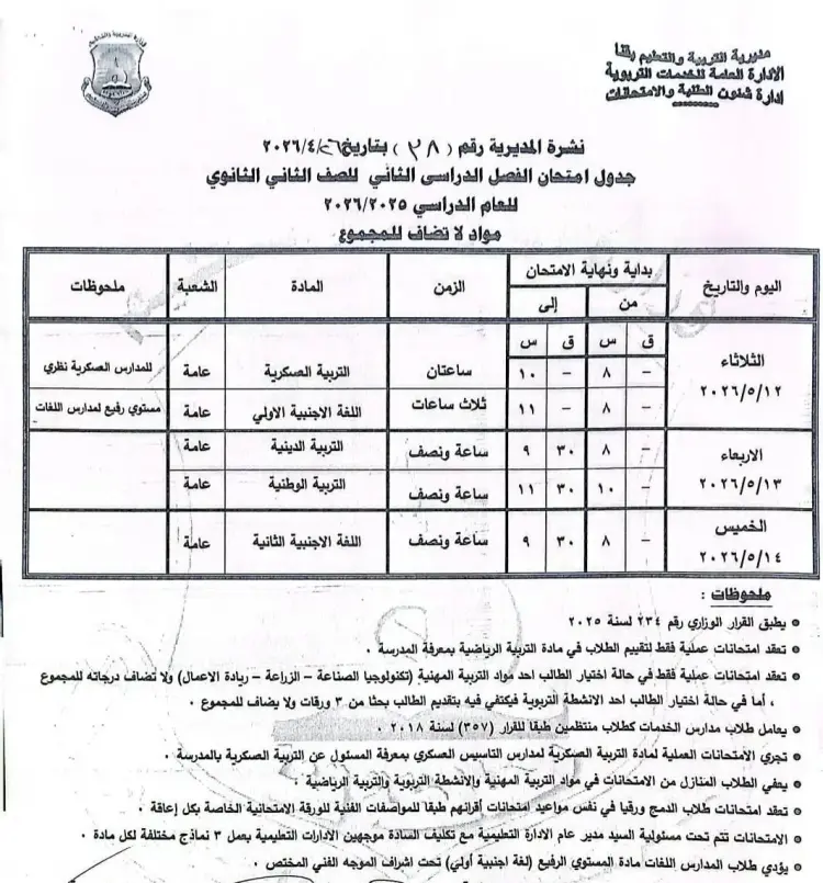 الثلاثاء 2026/05/12: مادة التربية العسكرية (نظري للمدارس العسكرية) من 08:00 إلى 10:00 - زمن الإجابة ساعتان.