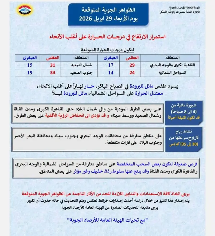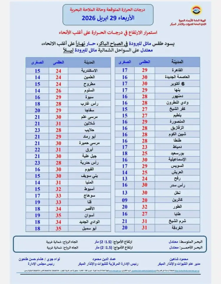 - سجلت القاهرة الكبرى والوجه البحري درجة حرارة عظمى تبلغ 29 درجة مئوية، بينما تنخفض الصغرى إلى 18 درجة.